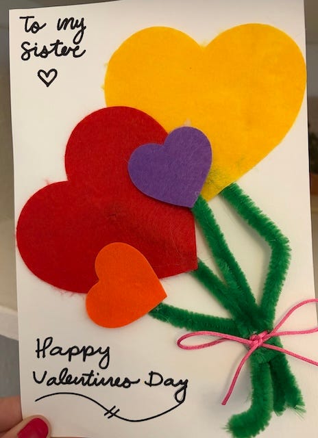 Not only did I receive one Valentine, but three! The first, a Valentine from my sister, Edna. It was on the shelf in her room, and made with the help of her caregivers at her day program. I am not sure how much she helped and that makes me sad — she used to be able to do so much, but I can’t dwell on that. Receiving this was like a hug.
